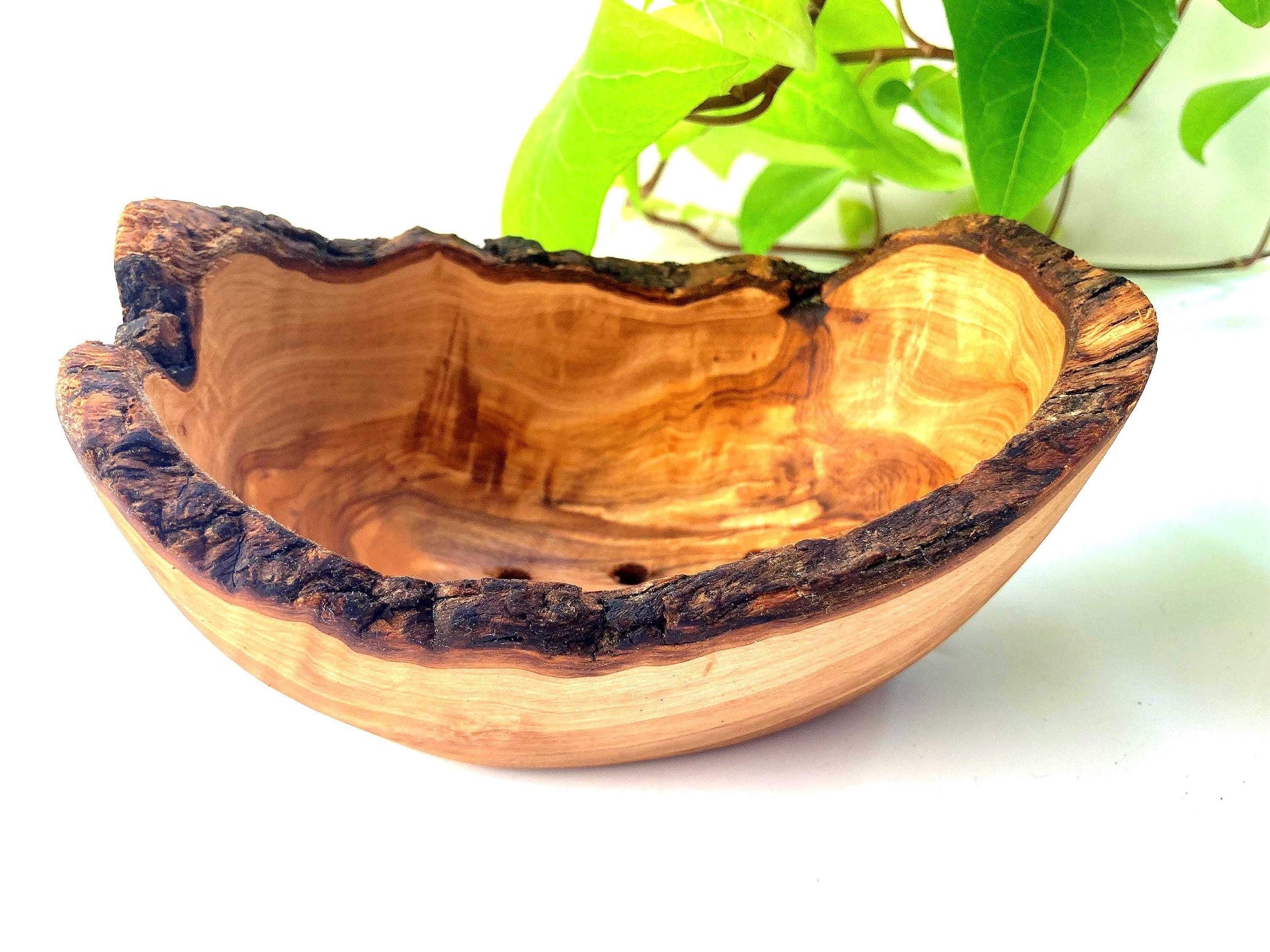 Beautifully handcrafted rustic olive wood wood soap dishes/bowls with a bark edge, sustainably sourced made from the fallen branches of olive trees. Perfect for holding soaps, these bowls are self-draining with 3 convenient holes drilled through the bottom. They give a fantastic natural feel to the bathroom.